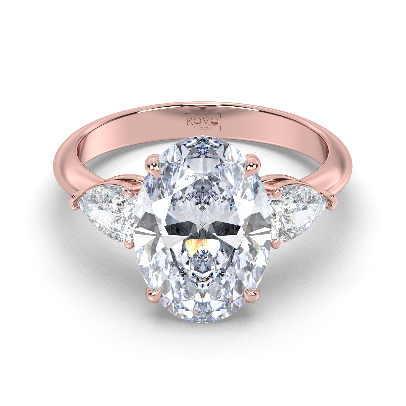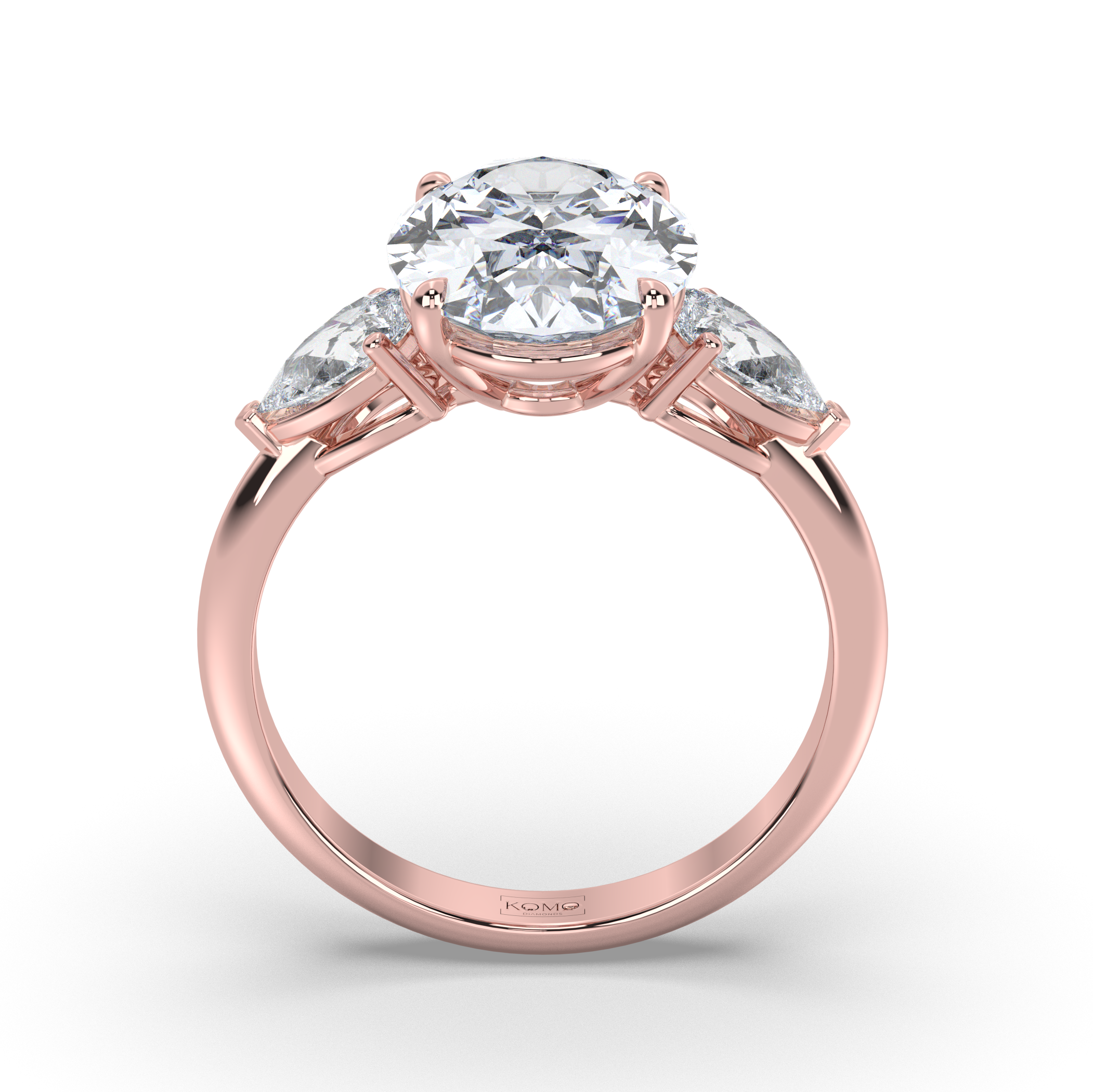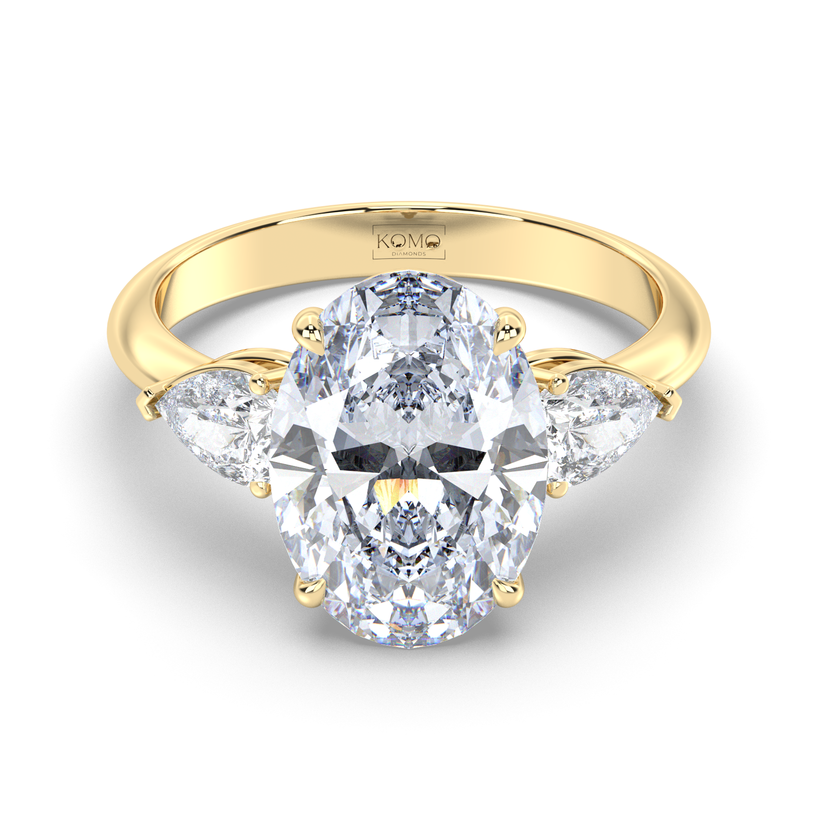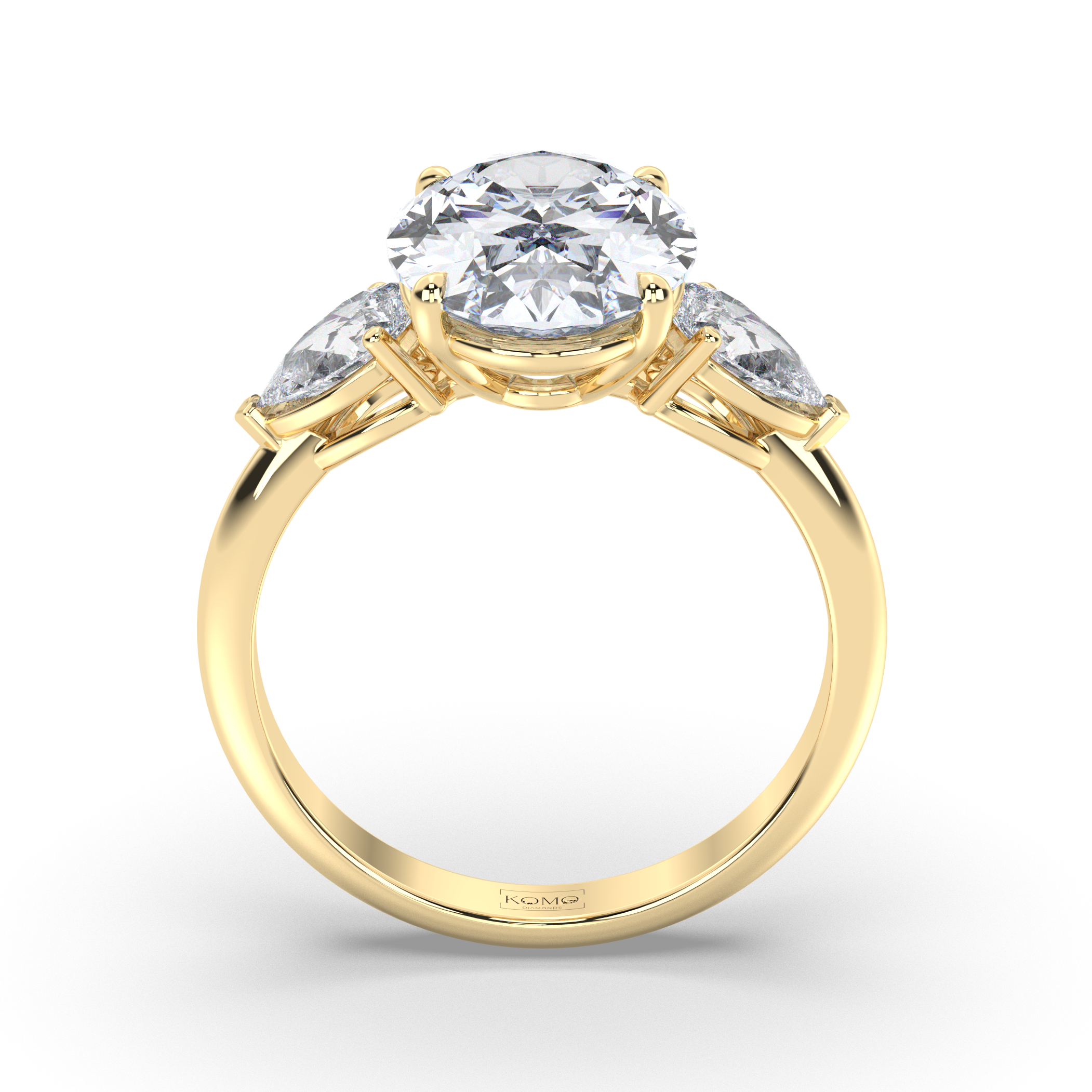 Experience the breathtaking beauty of the Odessa engagement ring, where timeless romance meets contemporary craftsmanship. This stunning three-stone design features a magnificent oval-cut lab-grown diamond center stone, gracefully flanked by two brilliant pear-shaped diamonds that create a symphony of light and elegance.