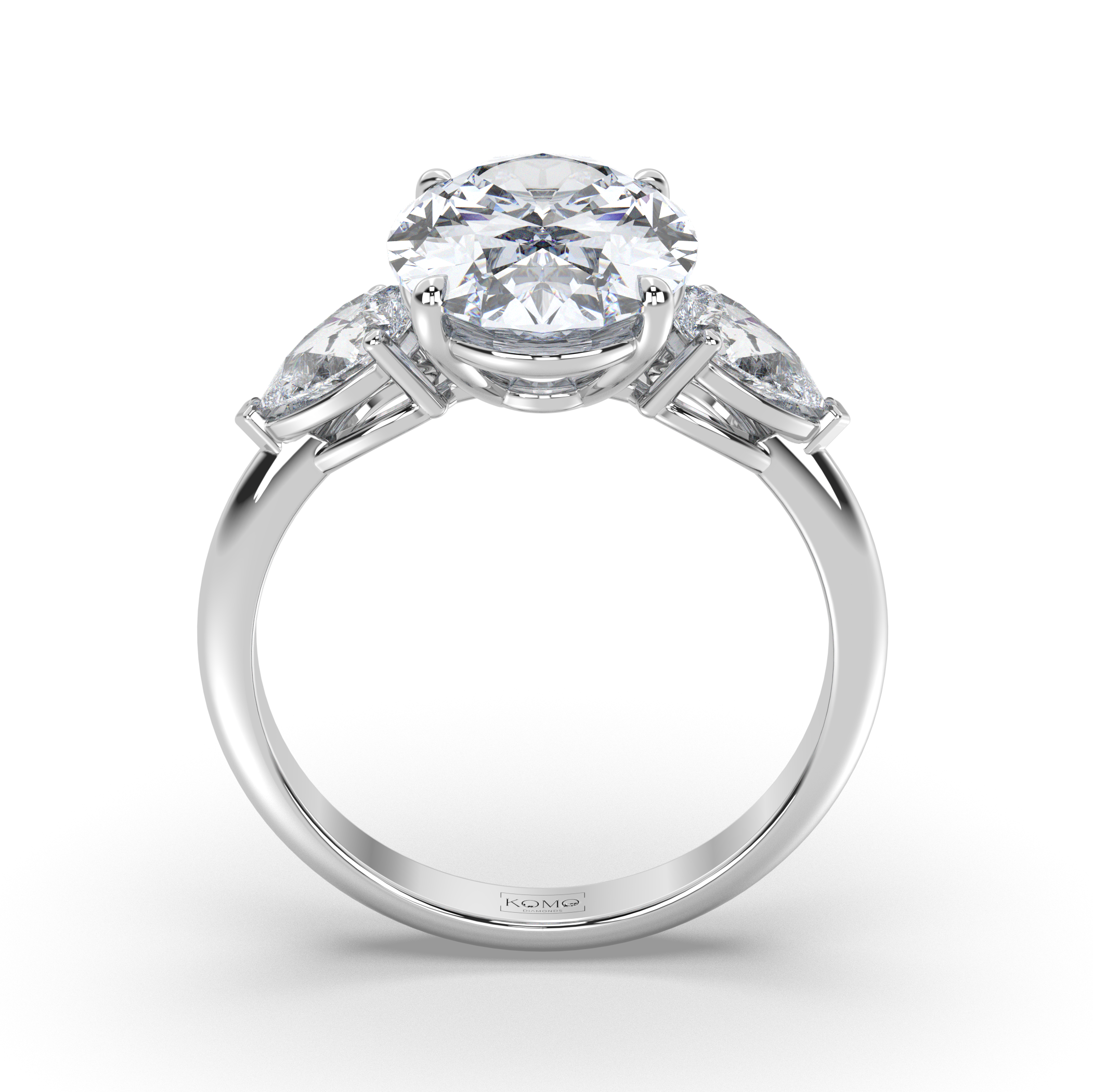 The Odessa's sophisticated trilogy setting showcases centuries of jewelry-making tradition enhanced by contemporary precision. The 4-prong center mounting secures the oval diamond while allowing maximum light penetration, while the 3-prong V-tip side settings protect the delicate points of the pear diamonds while maintaining their graceful silhouette.