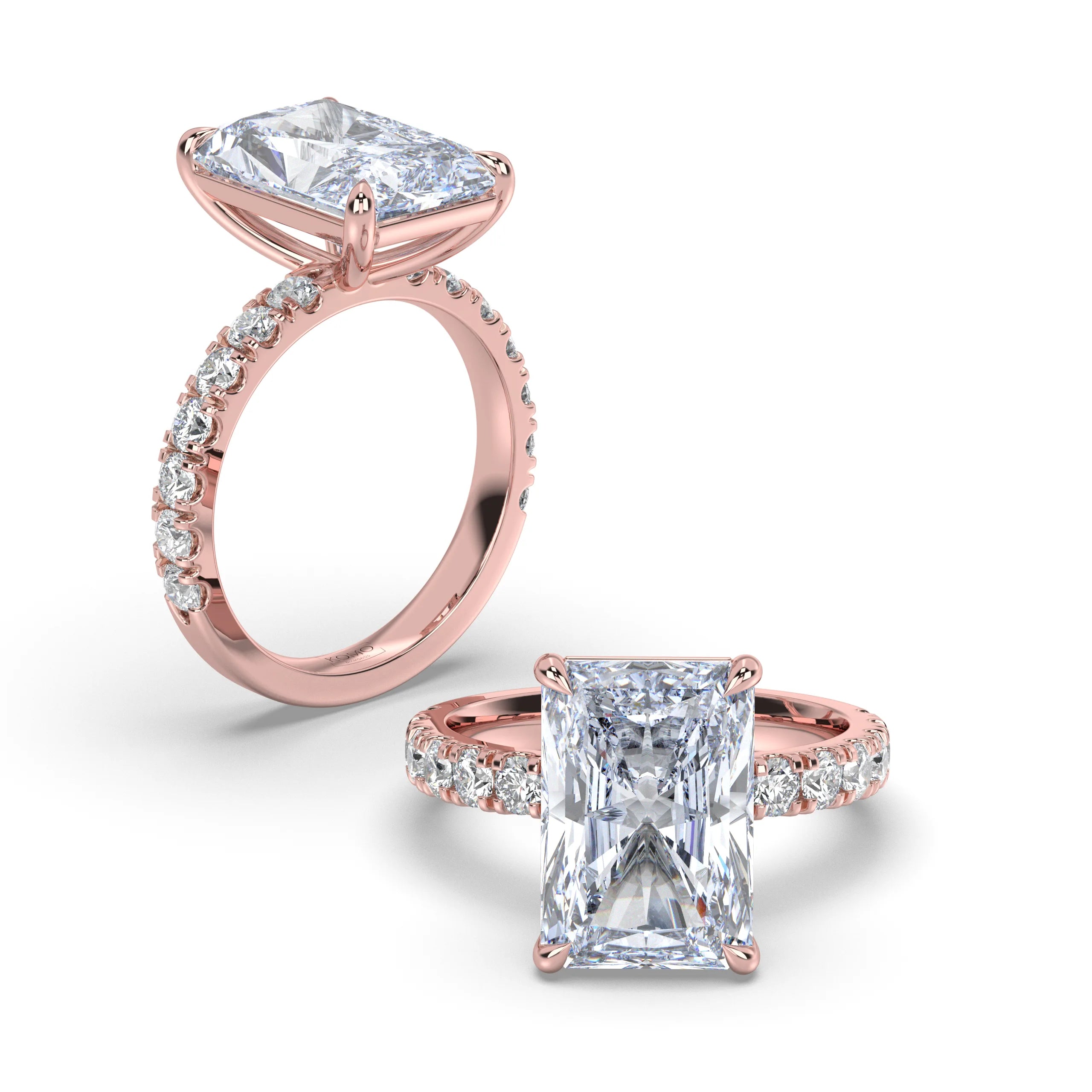 Discover the architectural brilliance of the Cassia lab grown diamond engagement ring—where a magnificent radiant-cut centerstone meets precision pavé setting, creating a symbol of love as bold and enduring as the geometric masterpieces that inspired its creation.