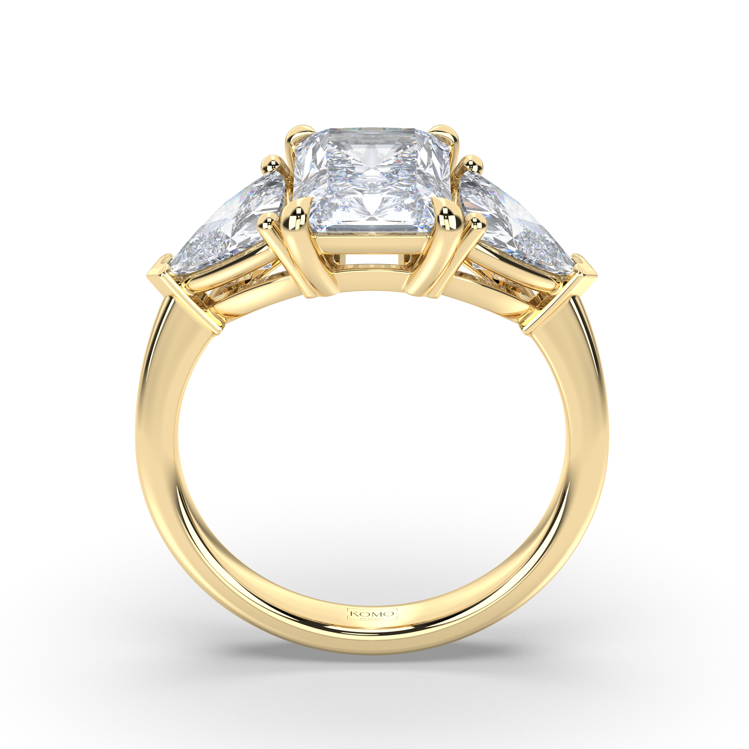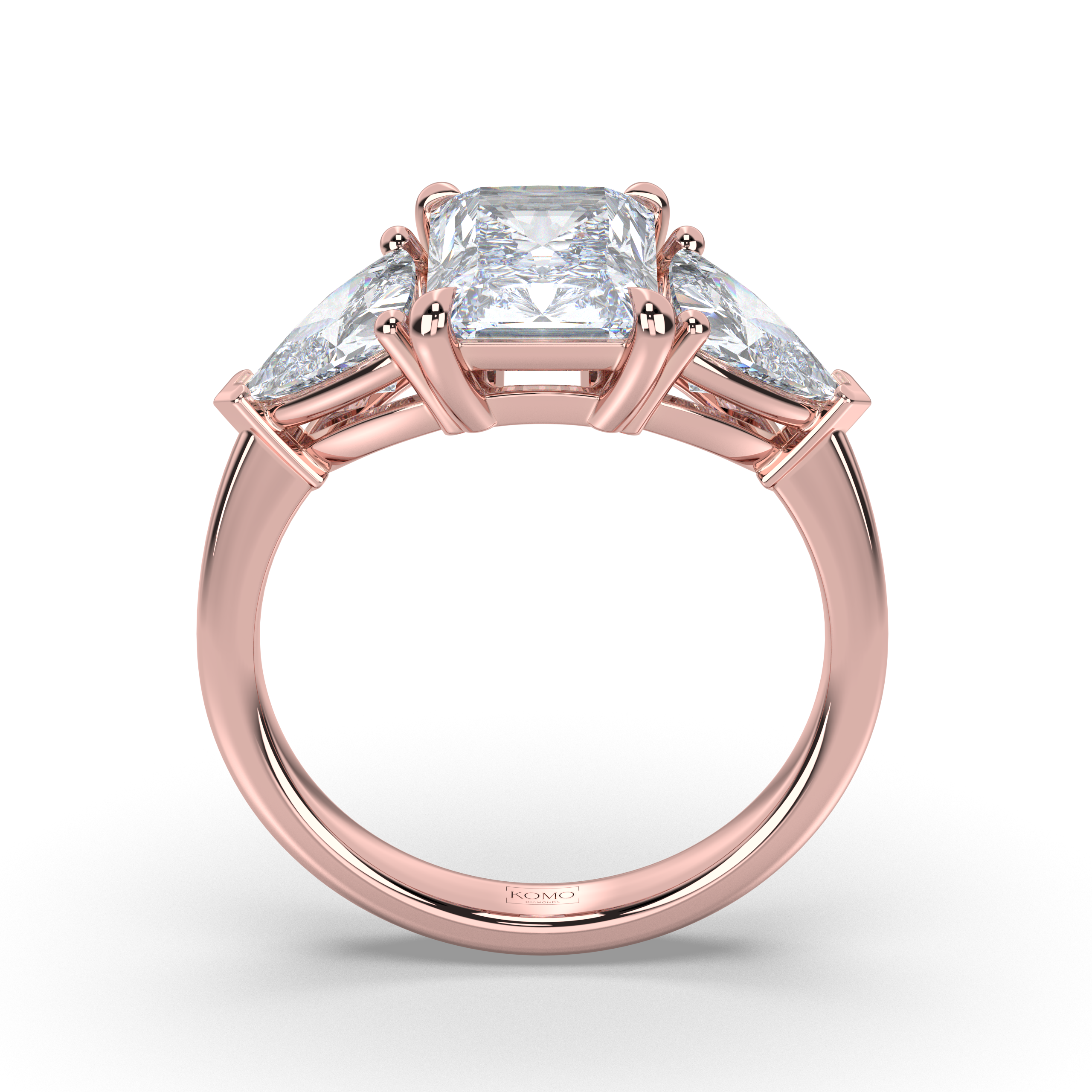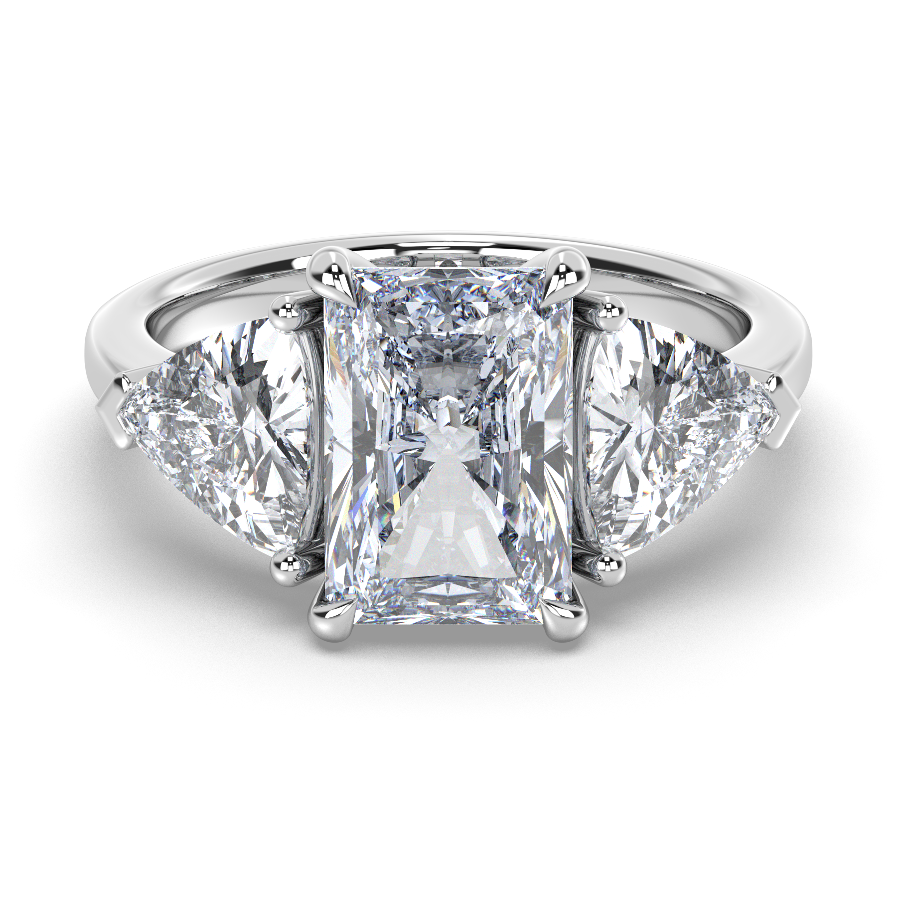 Embrace the extraordinary beauty of the Serena diamond engagement ring, a stunning three-stone masterpiece from our Vows collection that celebrates the sacred commitment of love through innovative design and modern sophistication. This magnificent piece combines the contemporary fire of a radiant cut with the dramatic geometry of trilliant side stones, creating a composition that honors tradition while embracing bold elegance.